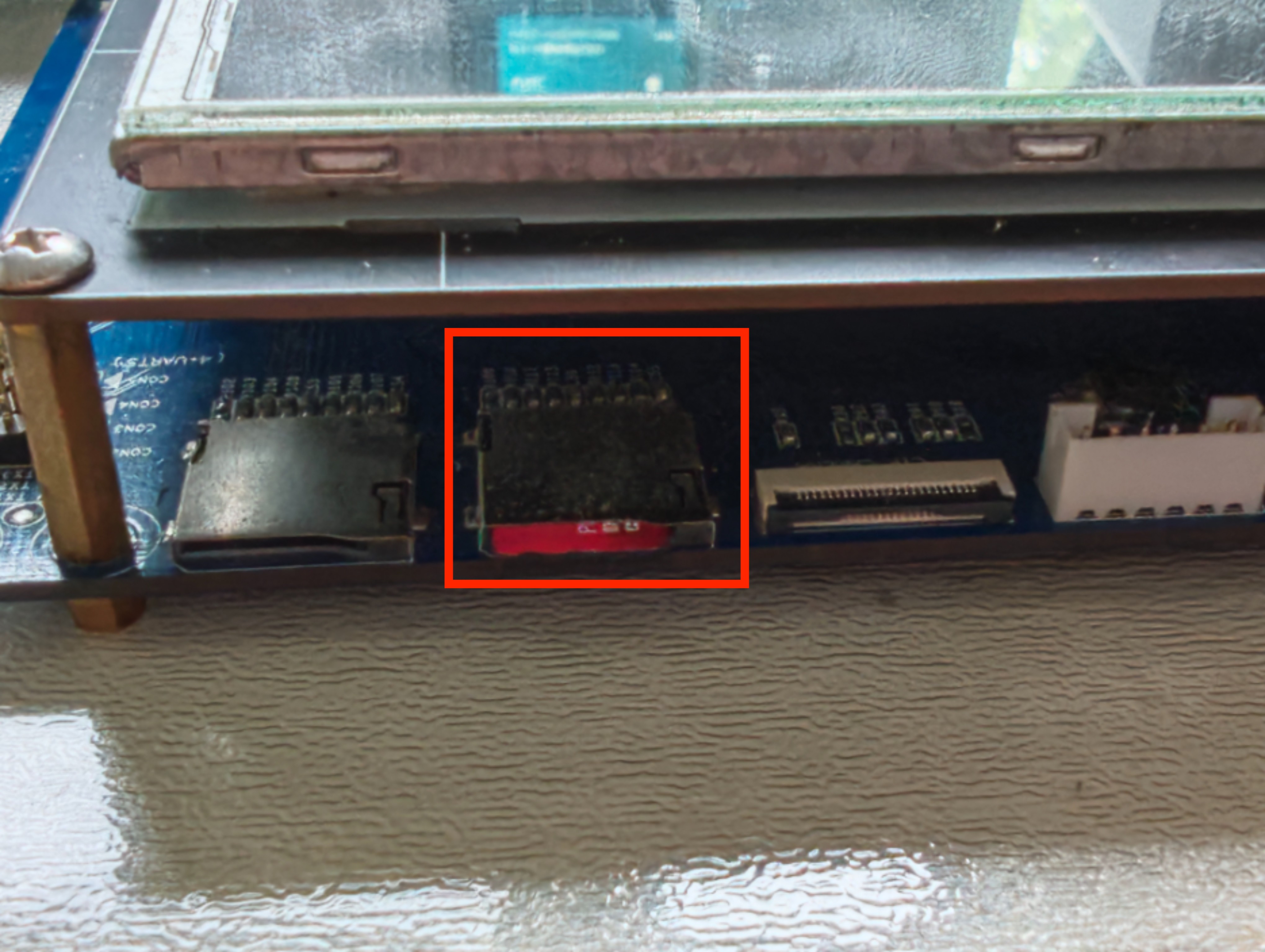 将SD卡插入开发板靠近中间的那个卡槽内: